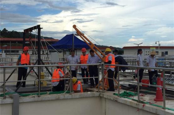 “深洞”中實(shí)施維修。經(jīng)過長達(dá)近8個小時堅(jiān)持不懈的帶水搶修作業(yè),維修人員終于在池底找到另一半斷裂的葉輪,并成功將攪拌機(jī)葉輪拆卸下來。剩下的工作,則更需要潼湖水廠和衷共濟(jì)、攻堅(jiān)克難,把斷裂的攪拌機(jī)葉輪焊接回原處。在高溫炙烤的悶熱天氣下,維修人員不負(fù)眾望、排除萬難,順利完成維修任務(wù),2組高效反應(yīng)池得以及時恢復(fù)正常使用。